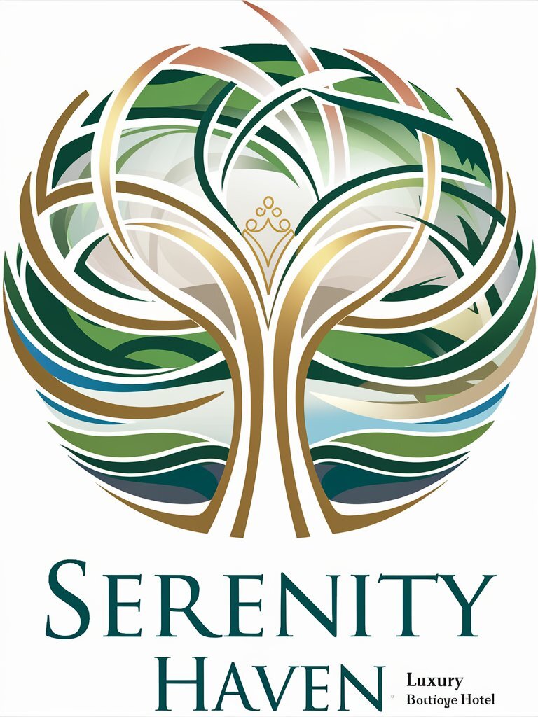 The hotel is located in a serene natural setting surrounded by lush greenery and tranquil lakes. It caters to affluent travelers seeking relaxation and rejuvenation. The logo should incorporate elements that evoke a sense of elegance, tranquility, and sophistication. Consider incorporating natural motifs such as leaves, trees, or water, along with subtle hints of luxury. The color palette should include calming tones such as shades of green, blue, and neutral colors. The logo should be versatile enough to work on various marketing materials, including signage, stationery, and digital platforms